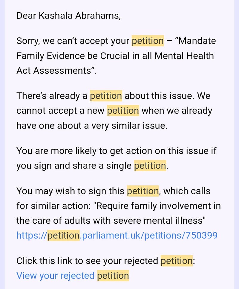 Yet, the NHS mental health systems fail continuously. They instead rank a brief assessment interview under the Mental Health Act by healthcare professionals who only know her for an hour, over decades of lived experience and ever growing concerns from her family members (and even some outside professionals.)